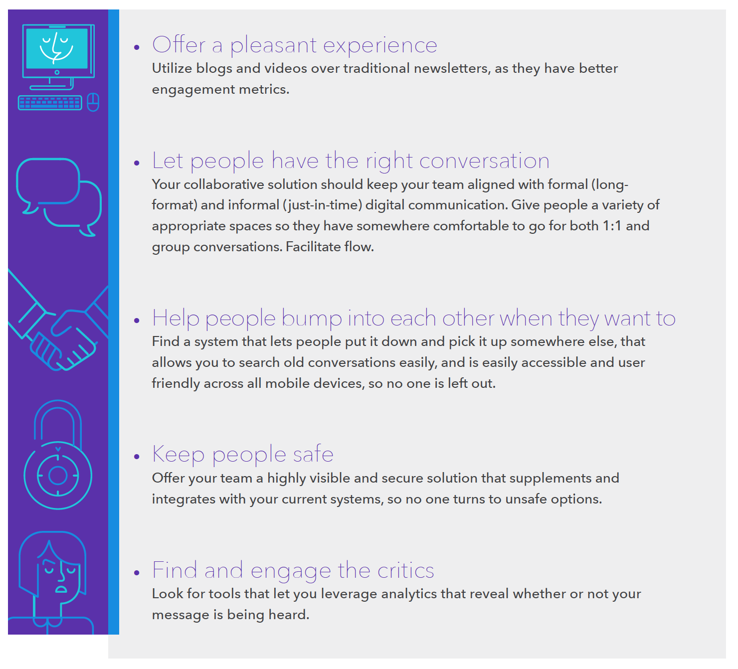 When a collaboration software company wanted a couple white papers about the future of collaboration and work, I mixed business, cultural, and tech trends to explain the landscape ahead of us. Then, I used experience design principles to provide helpful advice for adapting to new office trends. Find more here.